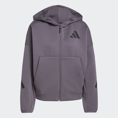 Embrace the feeling of belonging and community with this adidas Z.N.E. full-zip hoodie designed for women. The loose-fit track top is knit from a sustainable blend of 57% recycled polyester and 43% cotton, designed for maximum warmth and dryness with a unique three-layer doubleknit spacer fabric. Featuring matte rubber prints inspired by iconic field lines, tech-inspired drawcords and zippers, it offers an effortless mix of style, comfort and positive vibes.